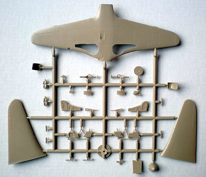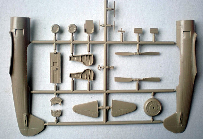 Bausatz:In der RS typischen attraktiven Schachtel finden wir die gut verpackten Spritzlinge, den Decalbogen und die Bauanleitung. Im bekannten Short-Run-Verfahren hergestellt, haben die Teile wie üblich feine versenkte Gravuren. Das Cockpit ist mit 15 Teilen ausreichend bestückt. Das Fahrwerk ist ordentlich detailliert. Es liegen zwei verschiedene Propeller bei.