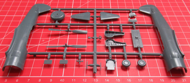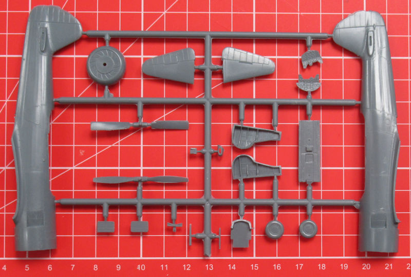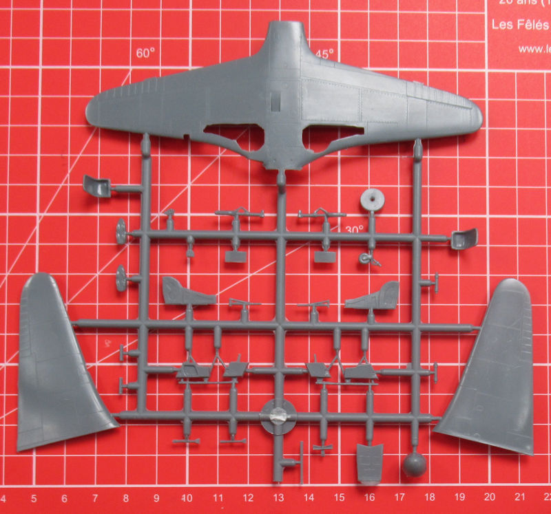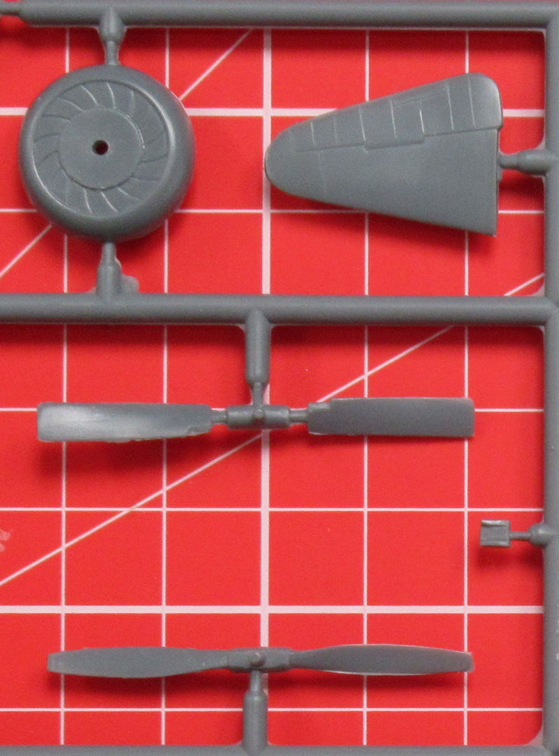 Aus drei Teilen besteht die Tragfläche. Die Fahrwerksschächte werden einzeln eingeklebt. Die beiden Hälften des Höhenleitwerks bestehen aus jeweils ein Stück. Damit gibt es dort scharfe Hinterkannten. Das Heckfahrwerk besteht aus einem Stück. Das Hauptfahrwerk ist gut detailliert. Die Fahrwerksklappen sind innen mit Details versehen. Bei der Luftschraube gibt es ein Alternativteil. Für all diese hier enthaltenen Decalvarianten wird nur die Nr. 41 verbaut.
