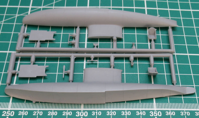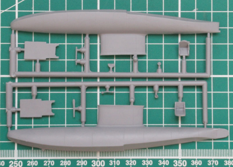 Nur beim Höhenruder gibt es scharfe Hinterkanten. Der Motor ist nicht nachgebildet. Die enge Öffnung würde auch keinen Blick darauf zulassen. Es gibt einen Auspuff und die Lufteinläufe müssen auf die Motorhaube geklebt werden. Der Zentralschwimmer wird aus zwei Teilen zusammengesetzt. Die Streben der Stützschwimmer müssen zusammengesetzt werden. Dafür müssen noch Verbindungsteile aus Rundmaterial angefertigt werden.