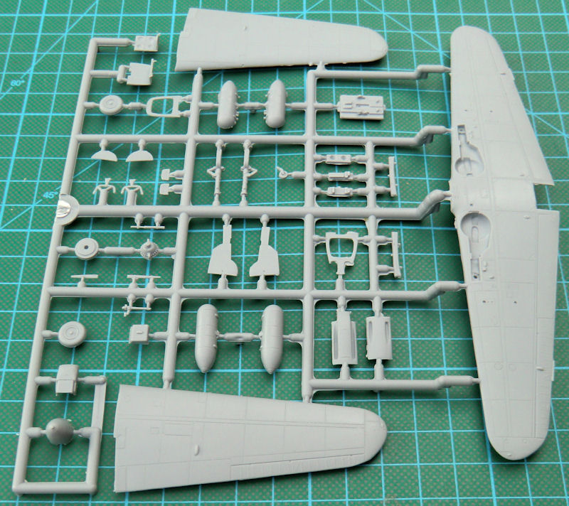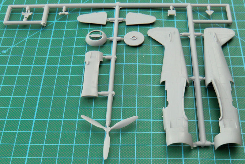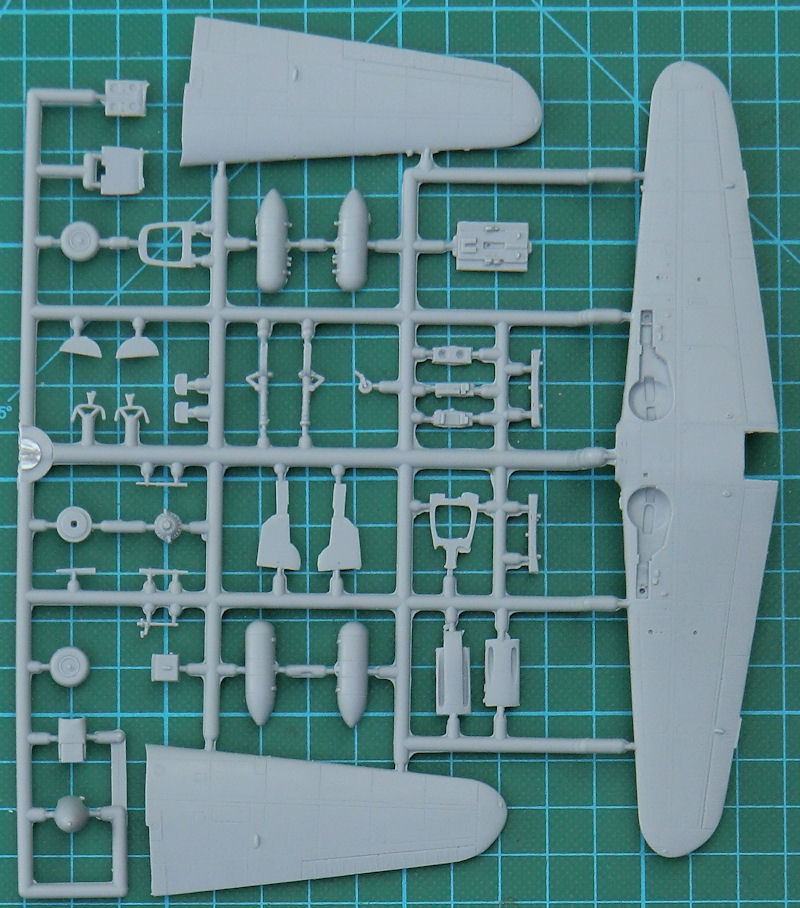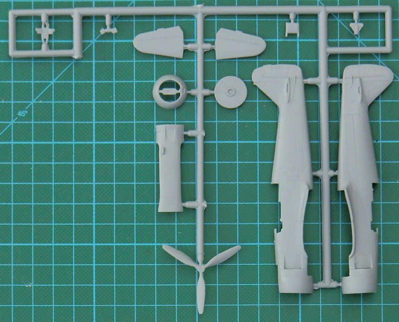Die beiden Höhenruderhälften sind aus einem Stück. Ansonsten gibt es die üblichen zwei Teile. Dafür hat RS den Lufteinlauf über dem Motor im Bug aus einem Teil separat gemacht. Die Klarsichtkanzel ist einteilig.