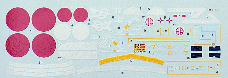 Bausatz: Mir sind Bausätze der Ki-100 von Aoshima und FineMolds bekannt. Beide sind eher schwierig zu bekommen. Da RSmodels auch die Ki-61-II-KAI im Angebot hat, war es nur eine Frage der Zeit bis die Ki-100 auch dort erscheint. In der attraktiven aber unpraktischen Schüttbox befinden sich gut verpackt 51 Spritzgussteile, die sich auf zwei Rahmen verteilen, ein Klarsichtteil, vier Resinteile, ein Decalbogen und die Bauanleitung. Die Resinteile 3 + 4 befinden sich auf der Rückseite eines Sterns vom Motor.