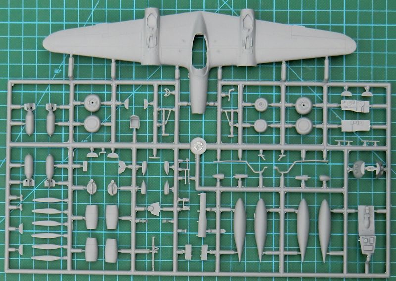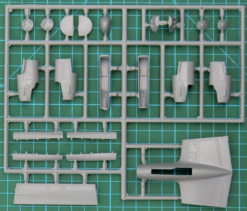 Die Luftschraubenblätter müssen einzeln ausgerichtet und angeklebt werden. Das Höhenleitwerk besteht aus einem Stück und auch die links und rechts des Seitenleitwerks befindlichen Endstücken sind jeweils einteilig. RS liefert hier normale Spritzgussräder. Die Teile für den Turbolader werden einzeln eingeklebt.