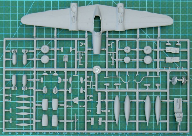 Die Luftschraubenblätter müssen einzeln ausgerichtet und angeklebt werden. Das Höhenleitwerk besteht aus einem Stück und auch die links und rechts des Seitenleitwerks befindlichen Endstücken sind jeweils einteilig. RS liefert hier normale Spritzgussräder. Die Teile für den Turbolader werden einzeln eingeklebt.