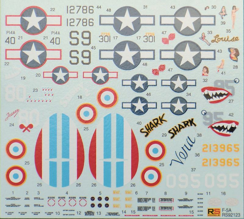 Die Farbangaben sind verbal in Englisch. Der Decalbogen ist tadellos ohne Versatz auf hellblauem Trägerpapier gedruckt. Bei der F-5A sind die ausgesuchten Bemalungsoptionen keinesfalls langweilig! Es gibt eine ausführliche Anleitung zum Anbringen der Wartungshinweise.