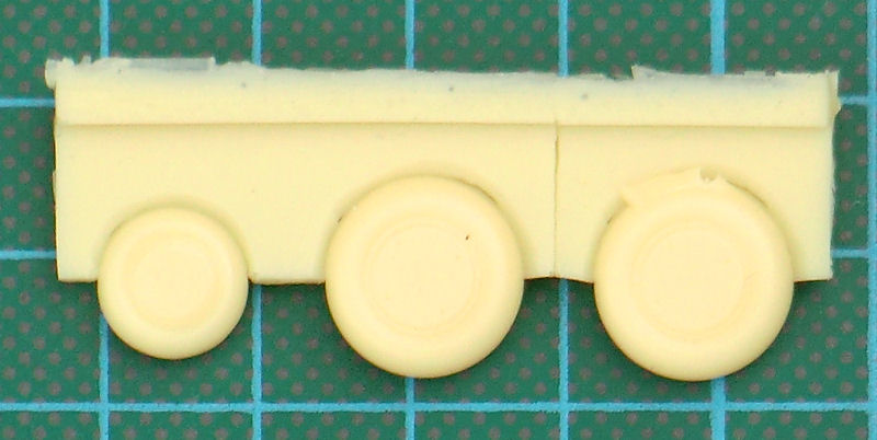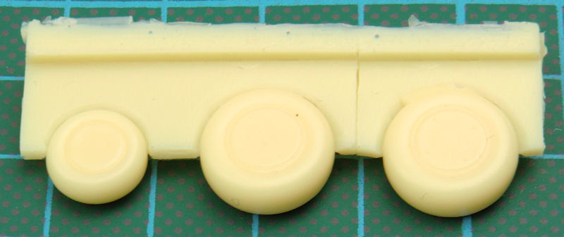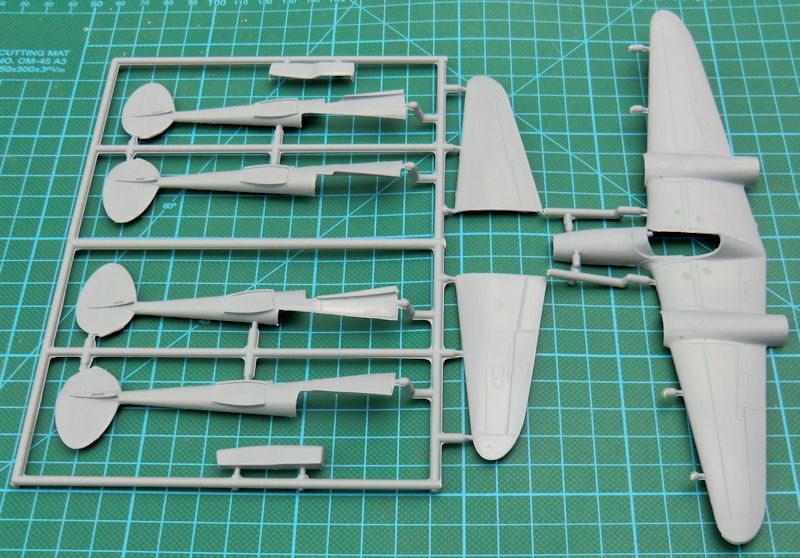 Die Luftschraubenblätter müssen einzeln ausgerichtet und angeklebt werden. Das Höhenleitwerk besteht aus einem Stück und auch die links und rechts des Seitenleitwerks befindlichen Endstücken sind jeweils einteilig. RS liefert schöne Resinräder. Leider sind diese nicht abgeplattet.