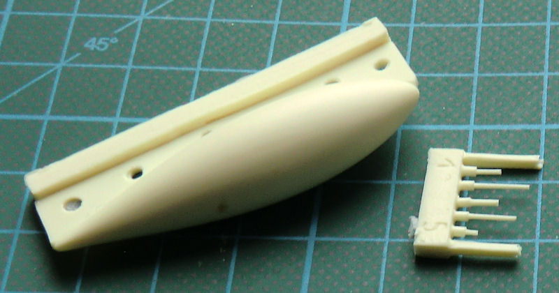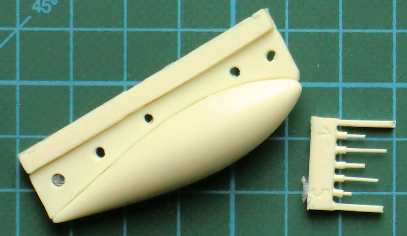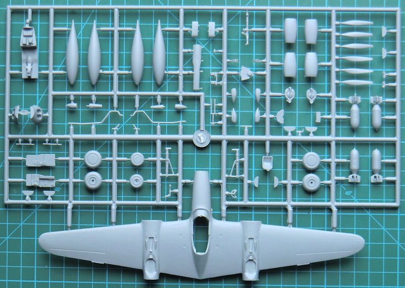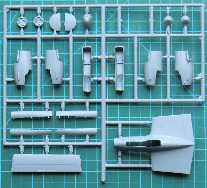 Die Luftschraubenblätter müssen einzeln ausgerichtet und angeklebt werden. Das Höhenleitwerk besteht aus einem Stück und auch die links und rechts des Seitenleitwerks befindlichen Endstücken sind jeweils einteilig. RS liefert hier normale Spritzgussräder. Die Teile für den Turbolader werden einzeln eingeklebt.