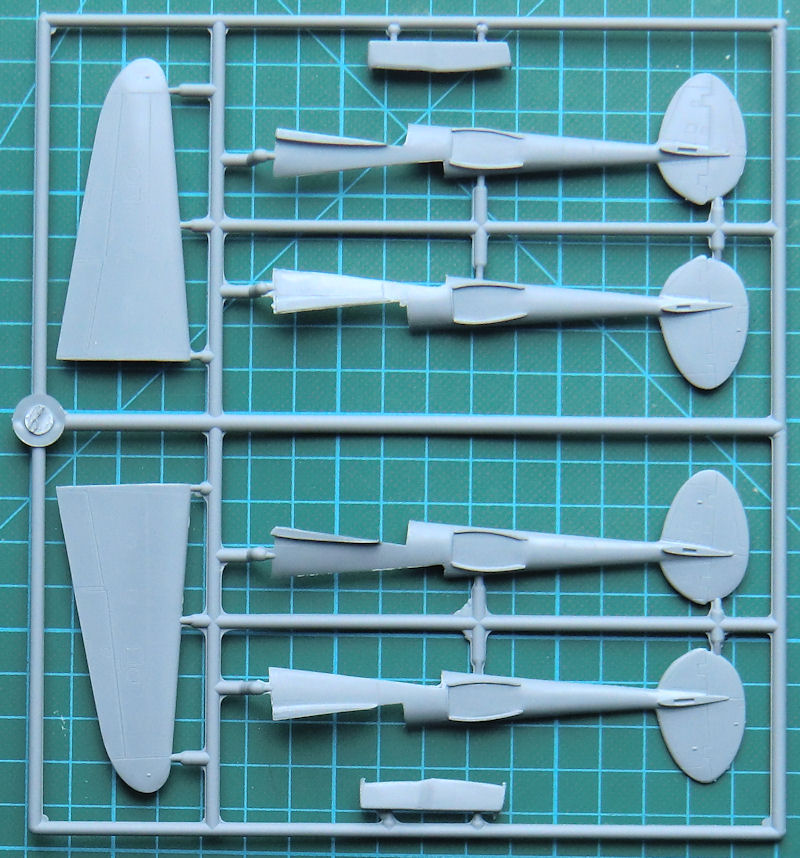 Bausatz: Hiermit legt Robert Schneider in 1/72 die G-Version der Lightning als Spritzgussbausatz nach. Äußerlich unterscheidet sich ja das Vorbild nicht von einigen anderen Versionen und somit gibt natürlich auch weitere RS-Bausätze der frühen USAAF-Einsatzversionen der Lightning. In der attraktiven aber unpraktischen Schüttbox befinden sich drei hellgraue Spritzgussrahmen mit 91 Teilen, ein Klarsichtteil, sechs Resinteile, ein Decalbogen und die Bauanleitung. Gegenüber den anderen frühen USAAF-Lightnings wurde nur der große Zusatztank aus Resin hinzugefügt.