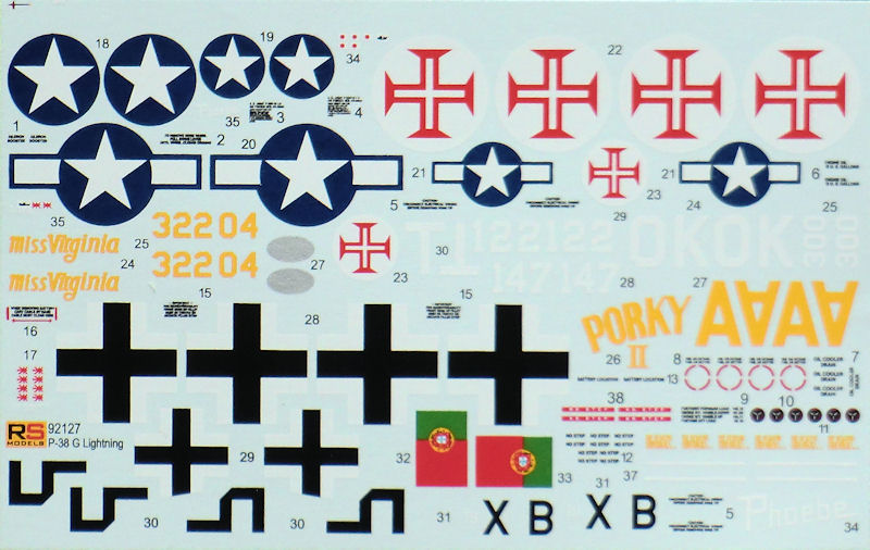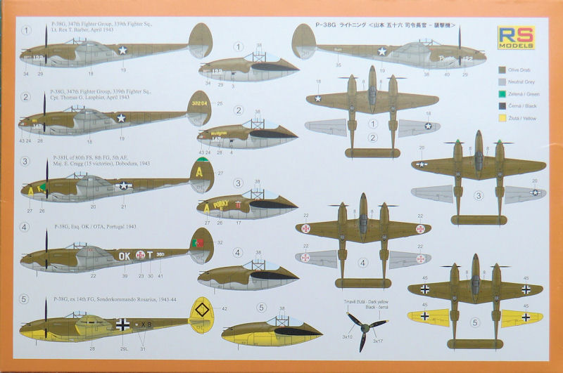 Die Farbangaben sind verbal in Englisch. Der Decalbogen ist tadellos ohne Versatz auf hellblauem Trägerpapier gedruckt. Auch bei der P-38G sind die ausgesuchten Bemalungsoptionen keinesfalls langweilig! Es gibt eine ausführliche Anleitung zum Anbringen der Wartungshinweise.