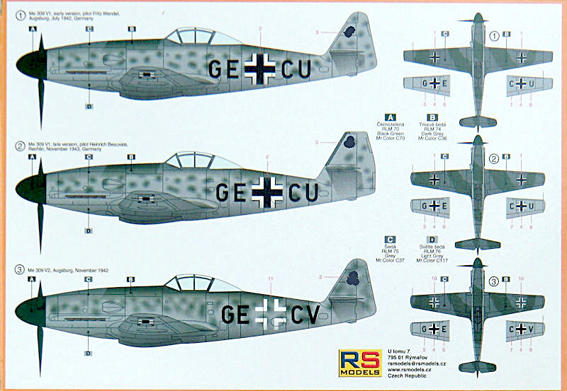 Als Bemalungshinweise dient die Kartonrückseite. Dort gibt man die RLM-Töne und die von Mr.Color an. Der Decalbogen ist tadellos auf hellblauem Trägerpapier gedruckt.