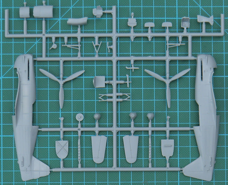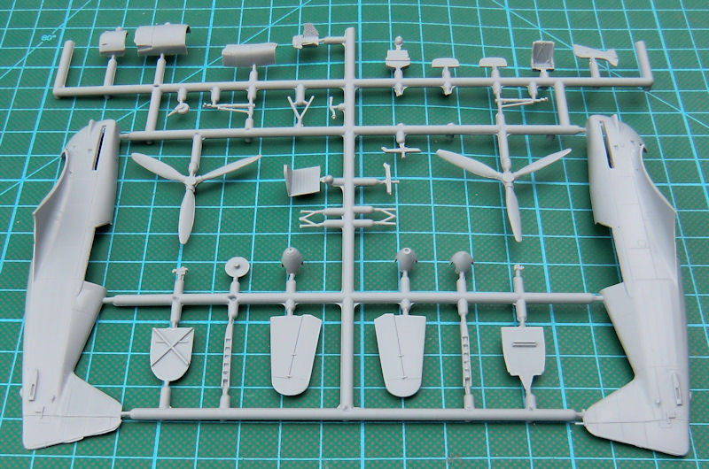 In der attraktiven aber sehr unpraktischen Schüttbox befinden sich gut verpackt zwei graue Spritzgussrahmen mit 56 Teilen, drei Klarsichteile, ein Decalbogen und die Bauanleitung. Ein paar Teile sind für die D-3801 bestimmt und wandern in die Restekiste.