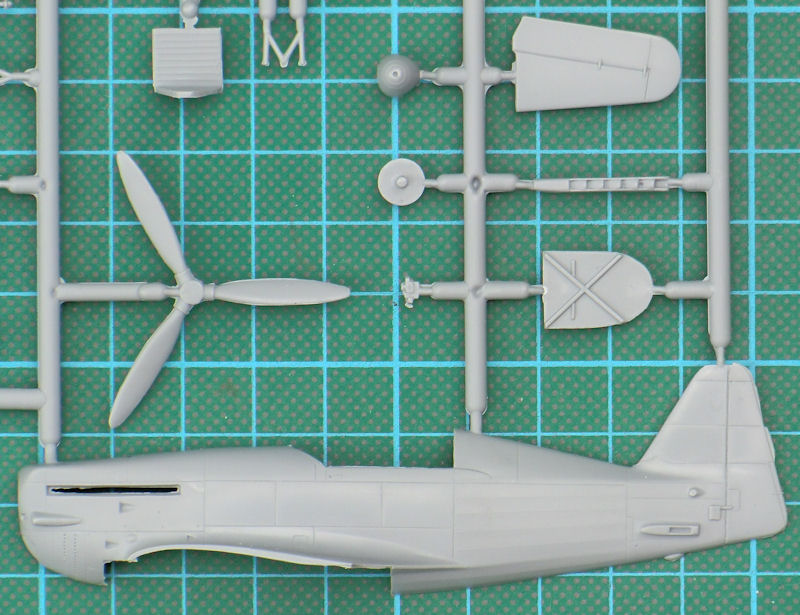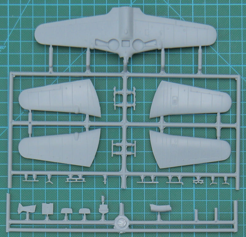Das Instrumentenbrett besitzt feine Strukturen und mit etwas Geschick sowie der Trockenmalmethode können die Details gut herausgearbeitet werden. Schön sind die aufmodellierten Sitzgurte auf dem Pilotensitz. Die Rumpfinnenseiten sind auch gut detailliert. Da die Cockpithaube einteilig ist, ist die Detaillierung hier in diesem Bereich völlig ausreichend. Gut gemacht ist auch die Kühlerkonstruktion. Die beiden Höhenleitwerkshälften bestehen aus einem Teil und haben messerscharfe Hinterkanten.