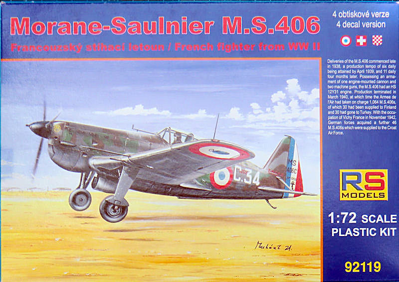 Bausatz: Vor gut zwanzig Jahren erschien bei Hasegawa in 1/72 innerhalb der schon damals hochpreisigen AP-Serie die M.S. 406. Jetzt hat RSmodels aus Tschechien einen Spritzgussbausatz von diesem wichtigen WK II-Jagdflugzeug herausgebracht.