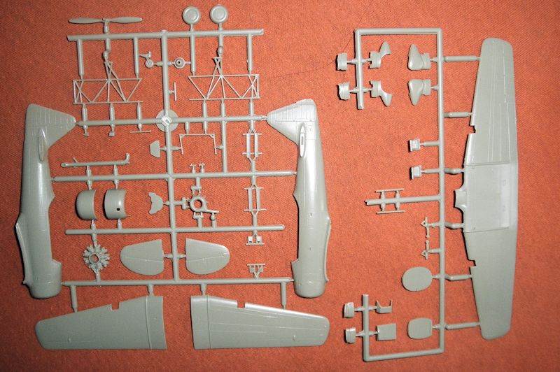 Zwei hellgraue Spritzrahmen mit sauber abgegossenen Teilen enthalten alles, um eine gute NAA.64 zu bauen. Die Gravuren sind fein und zeitgemäß. Die Rumpfinnenseiten im Bereich des Cockpits sind nicht graviert, aber wozu auch, dafür liegt ein Gitterrohrrahmen bei. Dazu kommen je zwei Sitze, Armaturenbretter, Steuerknüppel und Steuerpedale sowie der vordere und hintere Cockpitschott. Für die Armaturenbretter liegt ein kleiner Film bei, der die Instrumente darstellt. Der Motor besteht aus dem 9-Zylinder-Sternmotor und dem Auspuffsystem. Wer kann und möchte sollte den Auspuff jedoch aufbohren. Auch Fahrwerk und Räder sind gut gestaltet.