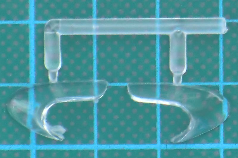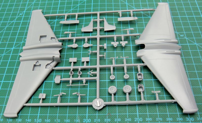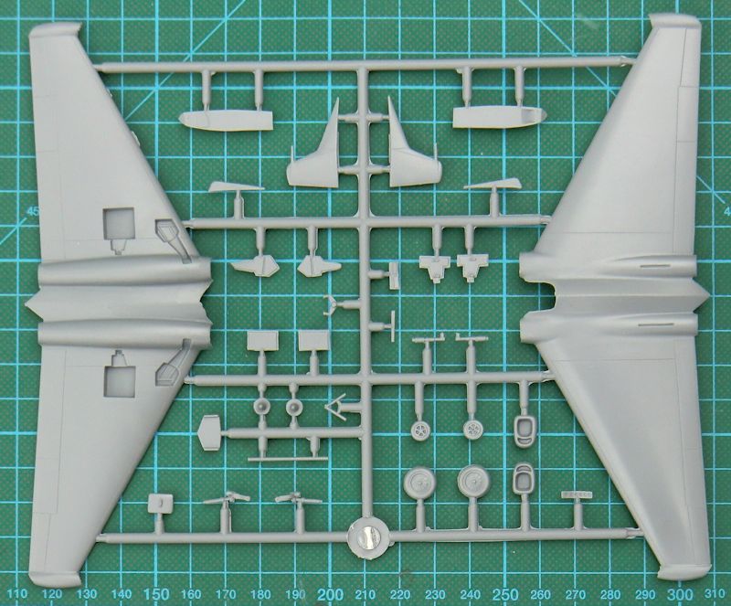 Die Abspritzung der Teile ist in Ordnung. Es gibt feine versenkte Strukturen. Die beiden Hauptfahrwerksschächte sind glatt. Das Cockpit für den liegenden Piloten besitzt immerhin ein paar Details. Die beiden Lufteinläufe sind nicht besonders tief. Die beiden Seitenleitwerke bestehen jeweils einem Stück. Dadurch sind die Hinterkanten scharf. Die vier Räder des Fahrwerks sehen recht ordentlich aus. Eine Frontansicht dient als Hilfestellung bei der Montage.