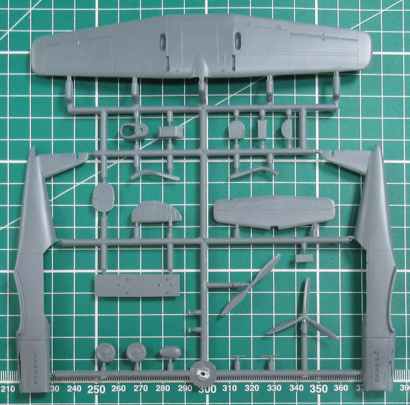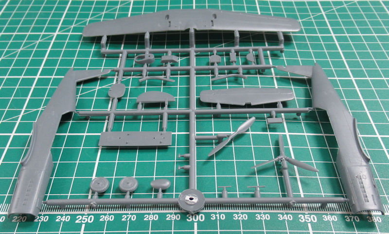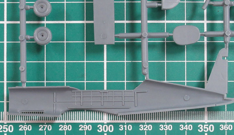 So findet man in der attraktiven aber unpraktischen Schüttbox zwei dunkelgraue Spritzlinge mit 60 Teilen, zwei Klarsichtteile, ein Decalbogen und die Bauanleitung. Es handelt sich um einen typischen RS-Bausatz. Es gibt hier eine leicht raue Oberfläche und feine versenkte Strukturen. Das Cockpit ist leider etwas einfach dargestellt. Hier findet man leider nur einen einfachen Boden, zwei Sitze, zwei Seitenrudergestänge, zwei Steuerknüppel und die Instrumentenbretter. Leider gibt es für letztere keine Decals. Weiterhin sollten die gut sichtbaren Sitzgurte ergänzt werden.