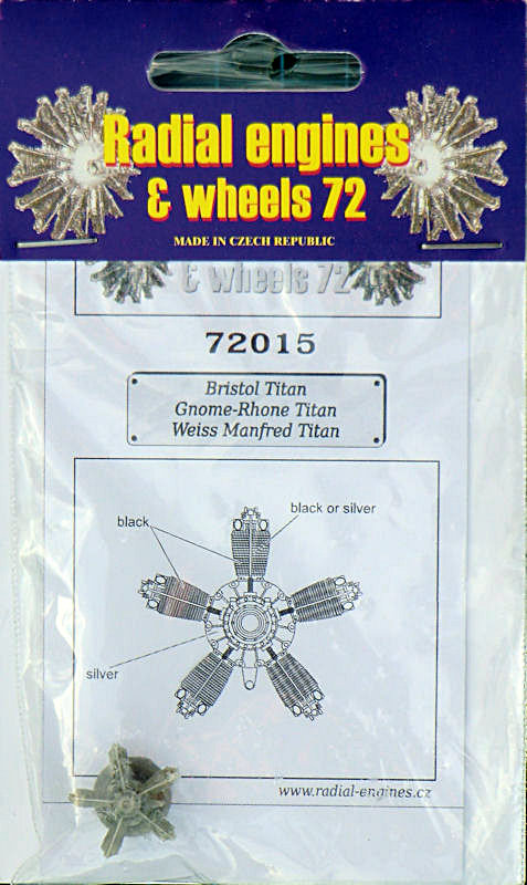 Bausatz: Radial engines & wheels aus Tschechien liefert in einer kleinen Tüte einen perfekt in einem Stück gegossenen Bristol Titan in 1/72. Dazu gibt es eine Skizze mit Bemalungshinweisen. Auf deren Rückseite gibt es eine Liste mit allen Flugzeugmuster, die diesen Motor als Antrieb nutzten.