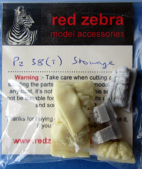 Der hier vorgestellte Satz dient der Beladung des Panzer 38(t) von Tamiya (First Look). Die Fahrzeuge werden von den Modellbauherstellern ja immer ziemlich nackt bzw. im Werkszustand dargestellt. Hier bieten kleiner Hersteller wie Red Zebra eine Option, wenn man nicht alles selber machen will. Der große Gerödel-Block ist für die Motorabdeckung während der Rest auf dem kleinen Panzer verteilt werden kann.