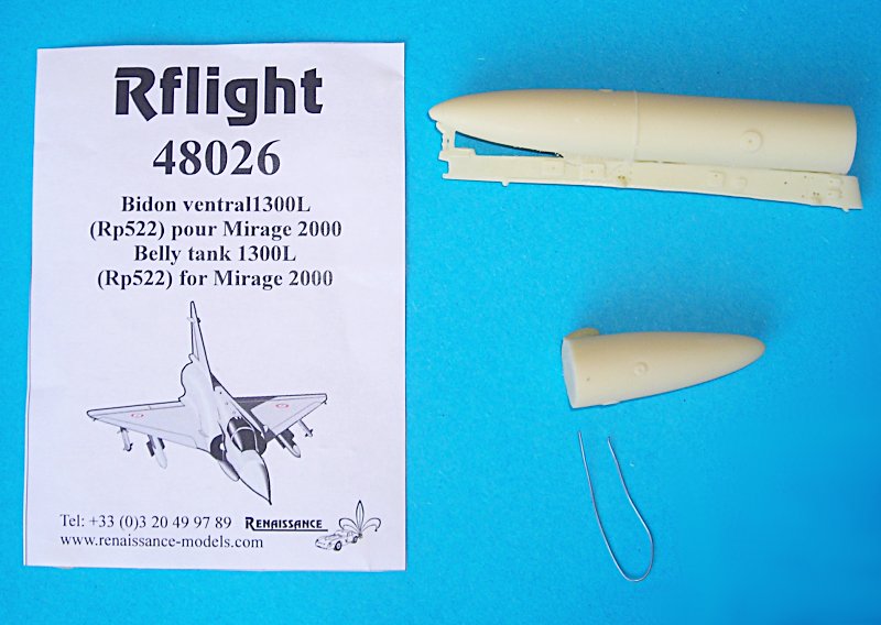 Die Mirage 2000 ist eines der besten Modelle von Heller. Leider gibt es nicht all zu viel Detaillierungssets dafür. Dieser Satz behebt ein kleines Problem des Modells. Der auf Fotos fast immer zu sehende "Centerline" Tank liegt nämlich nicht bei. Der Zurüstsatz von Renaissance enthält den Tank, an den der Pylon gleich mit angegossen ist. Die Detaillierung ist sehr fein und der Anguss an der Tankspitze lässt sich leicht mit einer Modellbausäge entfernen (ist auf dem Foto oben bereits geschehen).
