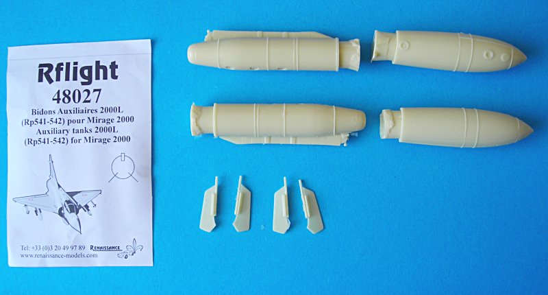 Dem Heller Kit fehlen neben dem Unterrumpftank auch die beiden großen Flügeltanks, die recht häufig an Einsatzmaschinen zu sehen sind. Der Satz 48027 enthält diese beiden Tanks. Auch hier sind die Pylone angegossen. Die Qualität ist gut. Jedoch habe ich an den Tankspitzen einen seltsamen Grat gefunden. Möglicherweise hat hier die Form eine Trennstelle, die beim Guss nicht optimal geschlossen war. Kein Beinbruch, aber schon ein wenig Aufwand.