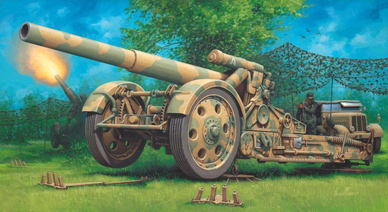 Vorbild: Ab 1939 wurde bei der Wehrmacht in Deutschland der von Krupp entwickelte 21 cm Mörser 18 eingesetzt. Dieser löste das veraltete Vorgängermodell ab. Es entwickelte sich zu einem Hauptgeschütz der schweren deutschen Heeresartillerie. Es wurde an nahezu allen Kriegsschauplätzen von der Wehrmacht im WK II eingesetzt. Durch die hohe Reichweite und der starken Geschosswirkung war der Mörser sehr effektiv. Zumeist wurde der 21 cm Mörser 18 zweilastig transportiert. Aus Zeitgründen wurde auch ein einlastiger Transport mit einem SdKfz. 9 FAMO durchgeführt.