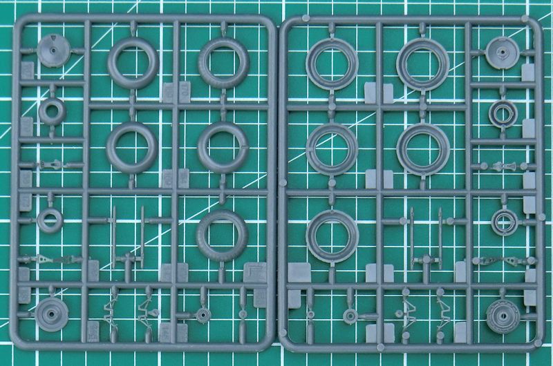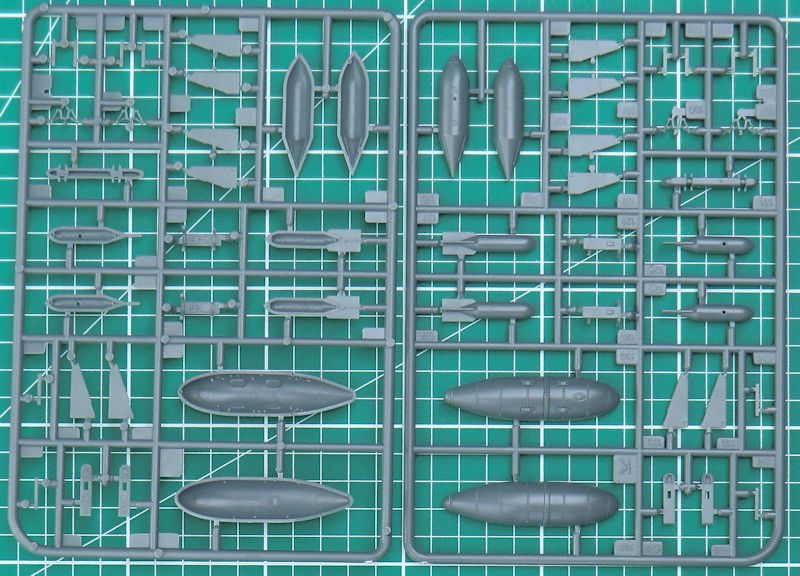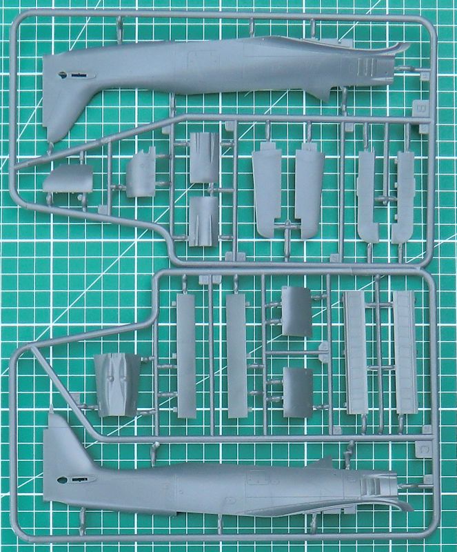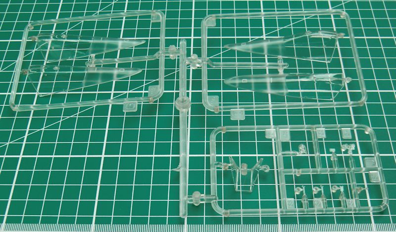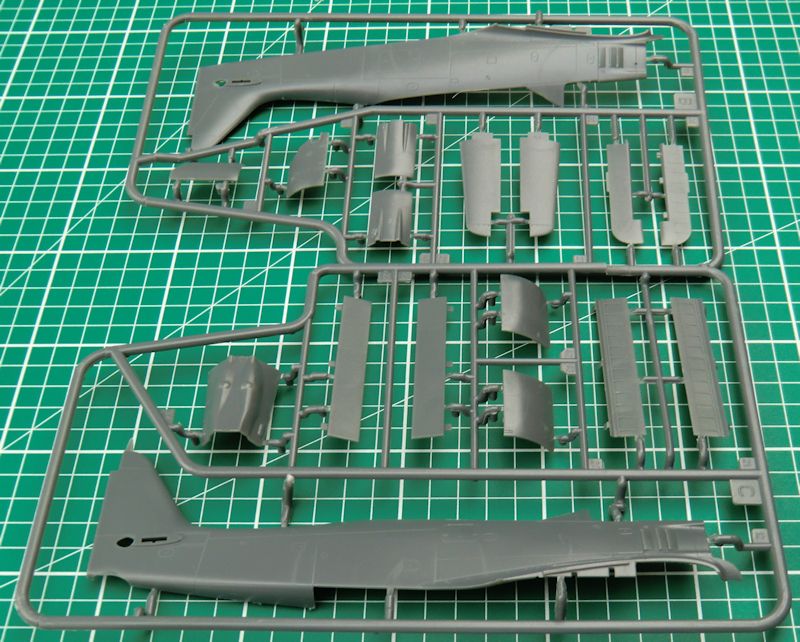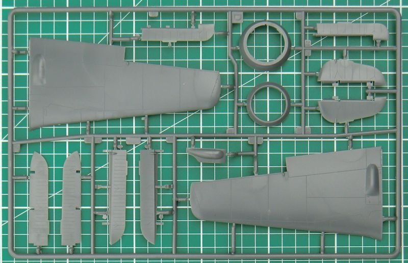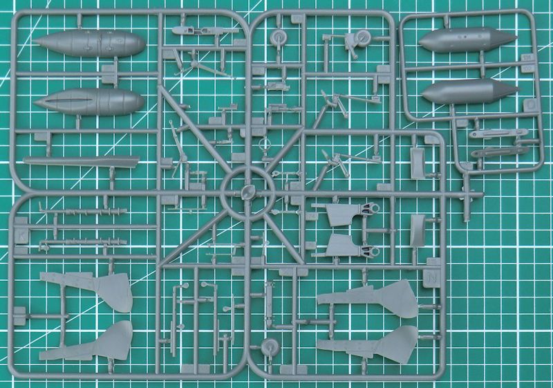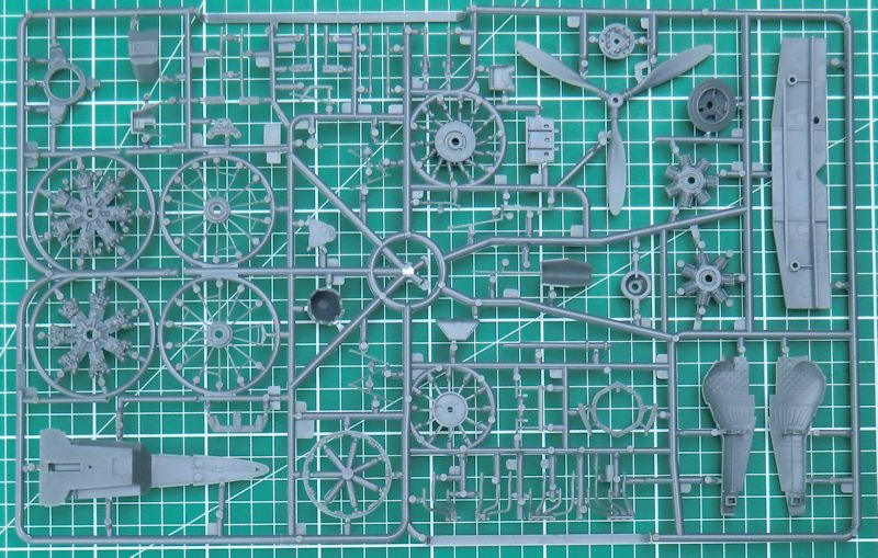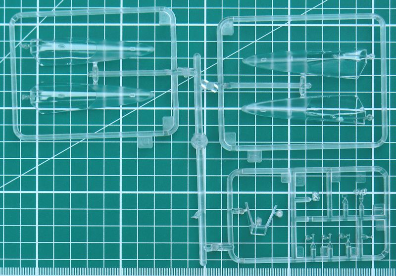 Es gibt neun graue Spritzlinge und einen Klarsichtrahmen. An letzteren befinden sich vier Schiebehauben der 190. Dabei gibt es frühe und späte Ausführungen. Ganz so, wie ich es mir vor über 10 Jahren beim 72er Bausatz gewünscht hätte…