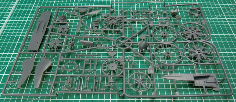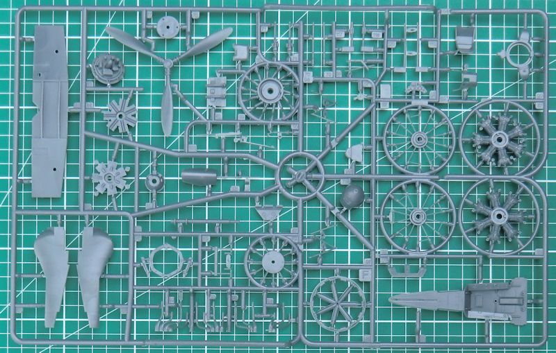 Alle Teile zusammen für den 32-fach verkleinerten BMW 801 füllen fast einen großen Spritzling. Der Motor kann somit aus dem Kasten schon ein Schmuckstück werden. Alternativ kann man bestimmte Hauben und Klappen offen montieren. Die Luftschraube besteht aus einem Stück.