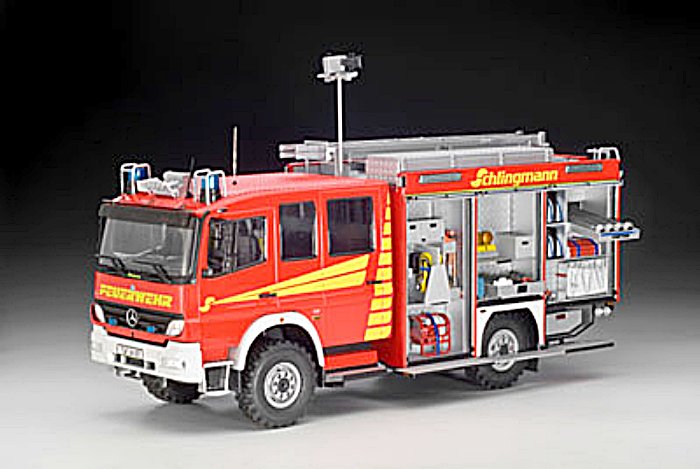 Vorbild: Das TLF 20/25 verfügt im Gegensatz zum HLF 20/16 (auch bei Revell erhältlich) über eine andere Ausrüstung und über Niederdruck-Einzelbereifung. Dieser Typ ist wesentlich weiter verbreitet und überbrückt beim Brandeinsatz die Zeit bis zur Fertigstellung der Fremdwasserversorgung.