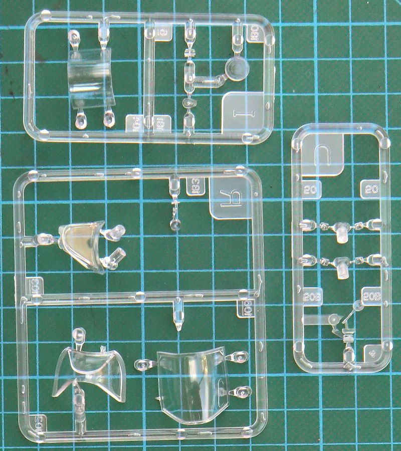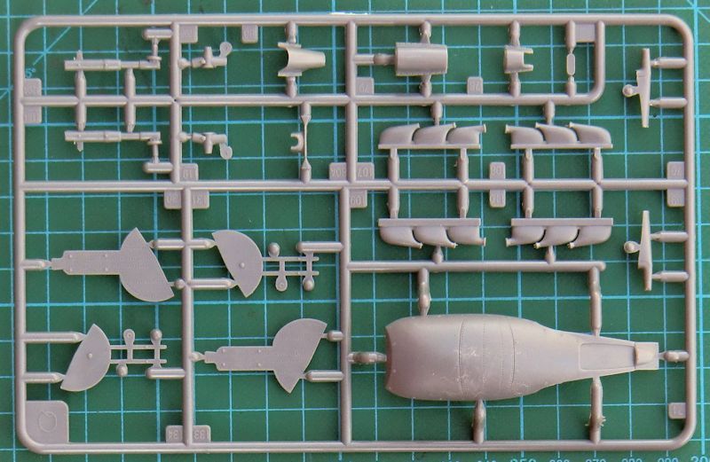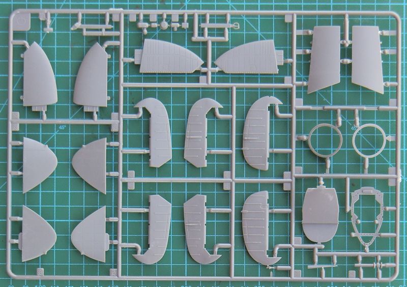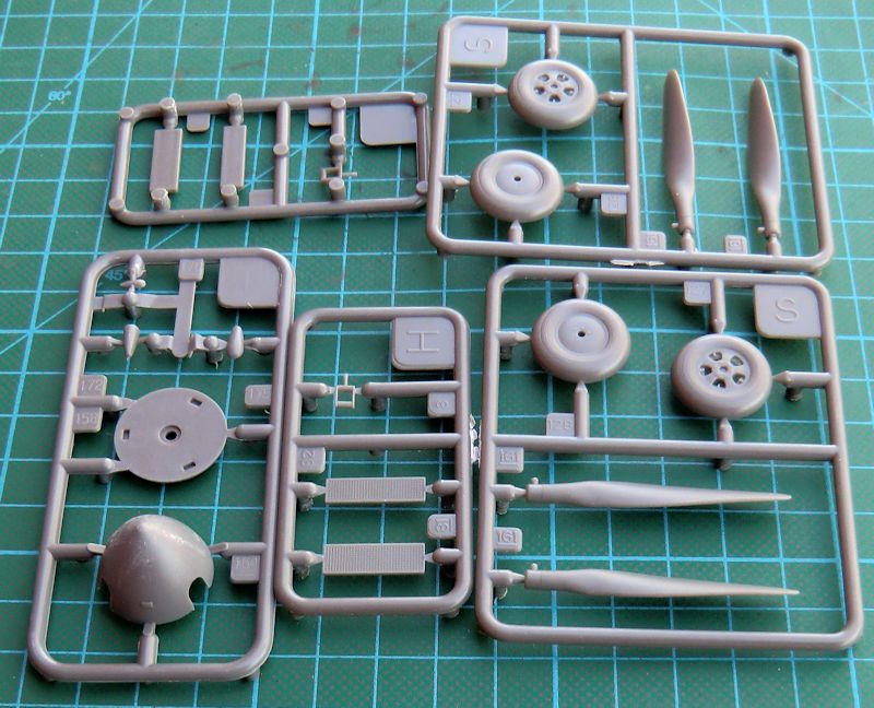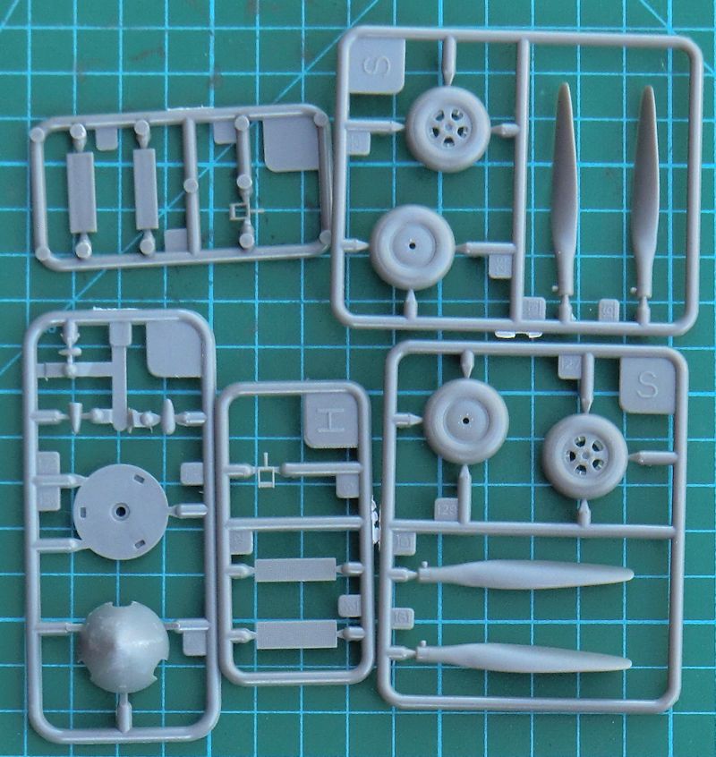 Der große Flächenkühler kann alternativ in geöffneter Stellung angeklebt werden. Gleiches gilt für die Cockpitklappe. Die Cockpithaube ist sehr dünn und klar. Alternativ kann die Schiebehaube offen bleiben. Die Luftschraubenblätter werden einzeln angeklebt und ausgerichtet. Eines ist für die Restekiste.