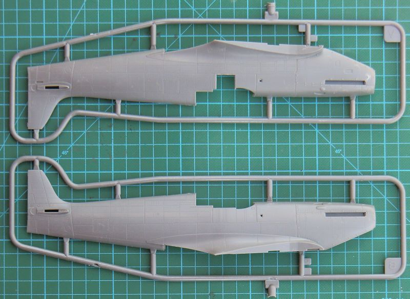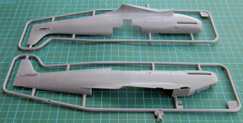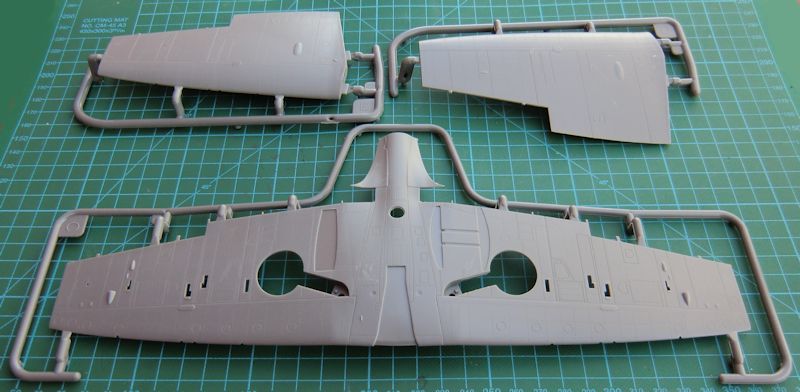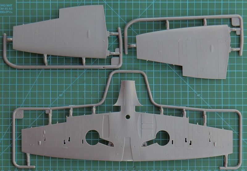 Die untere Hälfte der Tragfläche ist durchgehend. Im Bereich der Hauptfahrwerksschächte werden noch zwei runde Ringe eingeklebt und dann kommen die oberen Hälften drauf. Die Randbögen der Fläche werden separat angefügt. Gleiches gilt für die Querruder. Das Höhenleitwerk besteht aus acht Einzelteilen. Dadurch kann man das Höhenruder in ausgeschlagener Stellung ankleben. Gleiches gilt für das Seitenruder. Die beiden Auspuffrohre entstehen aus jeweils zwei Teilen. Dadurch sind die Enden hohl.