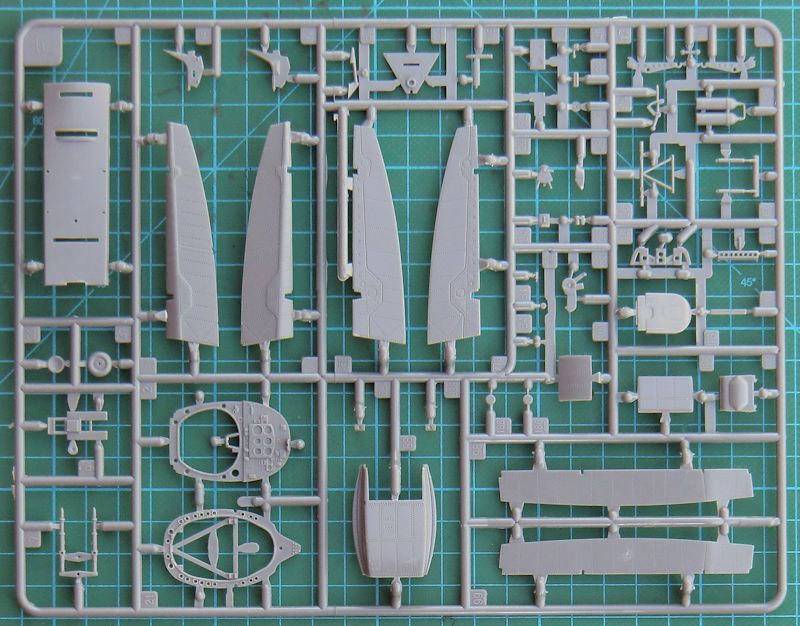 Bausatz: Uns liegt noch nicht der komplette Bausatz vor, sondern es handelt sich um einen finalen Testshot. Dieser entspricht der Produktionsausführung. Revell hat hier dreizehn graue Spritzlinge mit 120 Einzelteilen, drei Klarsichtrahmen mit dreizehn Teilen und eine übersichtliche Bauanleitung zur Verfügung gestellt. Einen Decalbogen gibt es noch nicht. Die Bauteile sind voll auf der Höhe der Zeit. Es gibt sehr schön gemachte Strukturen. Diese lockern das Modell gut auf.