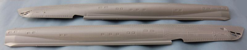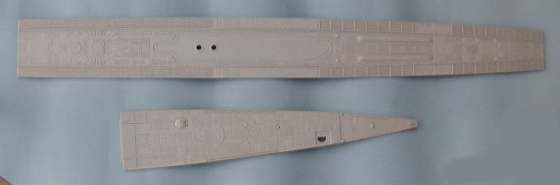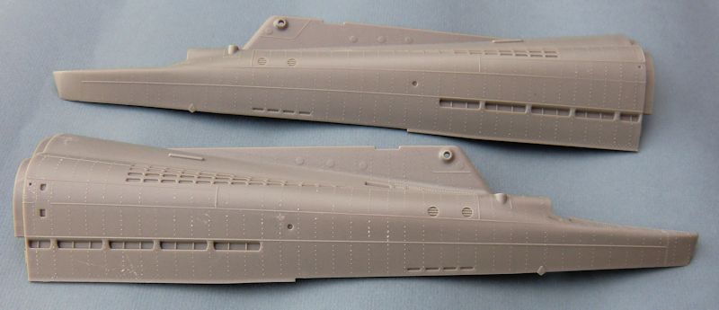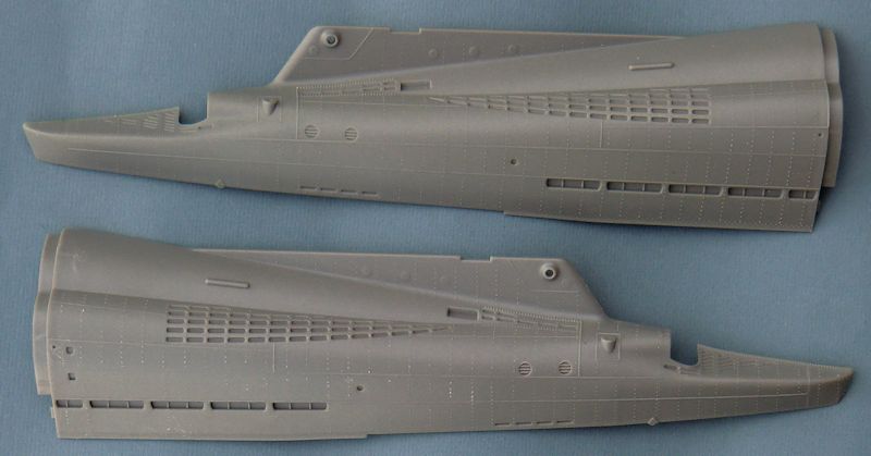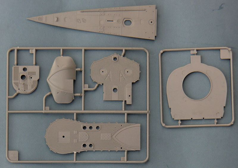 Die Abspritzung mit der Detaillierung ist voll auf der Höhe der Zeit. Mir persönlich gefällt diese besser als bei den damaligen Booten vom Typ VIIC. Ungewöhnlich ist die Vierteilung des Rumpfes. Diese ist dem Kartonmaß von Revell geschuldet. So gibt es das Heck separat. Das Deck besteht aus drei Teilen.