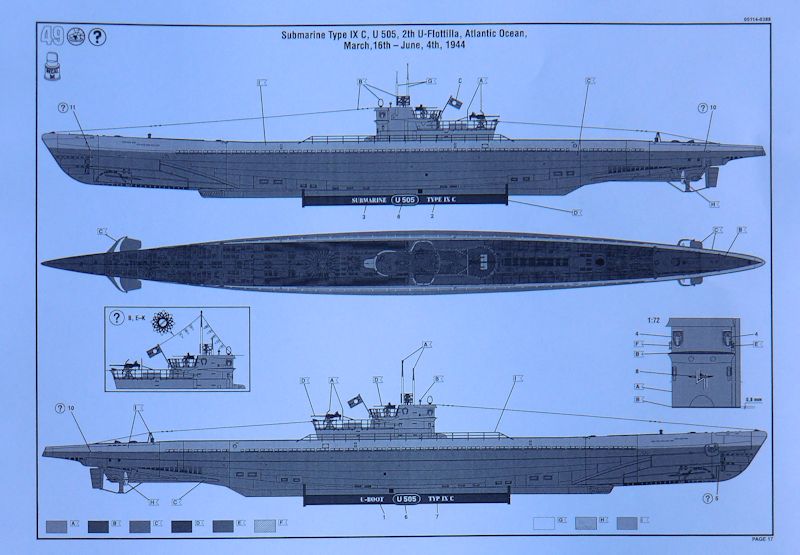 Bausatz: Vor gut zehn Jahren wagte sich Revell auf ein neues Gebiet und brachte ein U-Boot vom Typ VIIC in 1/72 heraus. Nun gibt es eine weitere Überraschung, den hiermit liegt das größere Boot Typ IXC vor. Es gibt 183 Teile, ein Decalbogen und die typische übersichtliche Revell-Bauanleitung. Ein paar Teile wandern in die Restekiste. Für die Präsentation gibt es einen stabilen Ständer.