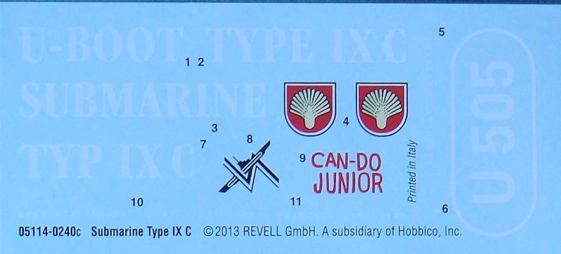 Auf den typischen Schwarz-Weiß-Bemalungshinweisen wird auch genau gezeigt wo welches Decal angebracht wird. Die Farbhinweise sind für das Farbsystem von Revell. Der kleine Decalbogen ist tadellos auf hellblauem Trägerpapier gedruckt. Damit kann man U 505 vor oder nach der Erbeutung durch die US Navy bauen.