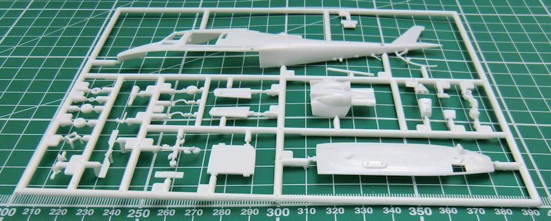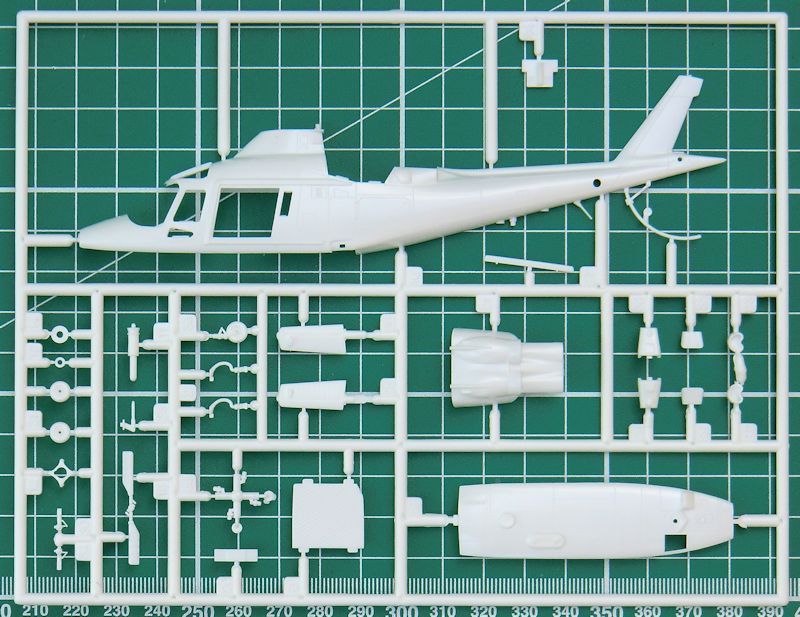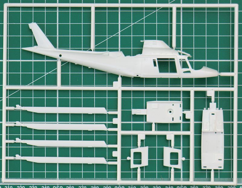 Die Teile sind sauber abgespritzt und es gibt feine versenkte Strukturen. Leicht durchhängende Rotorblätter sucht man allerdings vergebens. Die Klarsichtteile sind etwas dick aber schön durchsichtig.