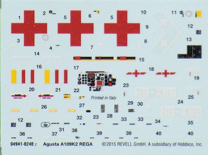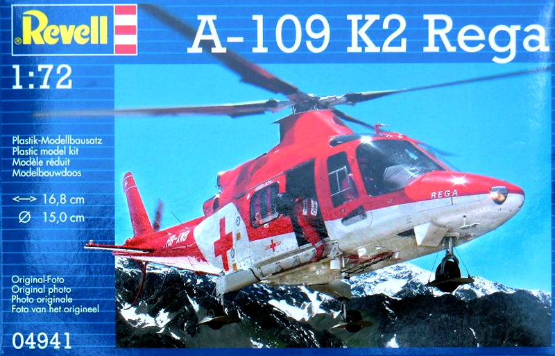 Bausatz: Revell bietet aus dem eigenen Formenfundus hier eine attraktive Wiederauflage der A-109K2 in 1/72 an. Dier Form wurde im Jahre 1999 hergestellt. In der typischen Revell-Schüttbox befinden sich gut verpackt drei weiße Spritzlinge mit 53 Einzelteilen, ein Klarsichtrahmen mit 13 Einzelteilen, ein Decalbogen und die Bauanleitung.