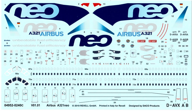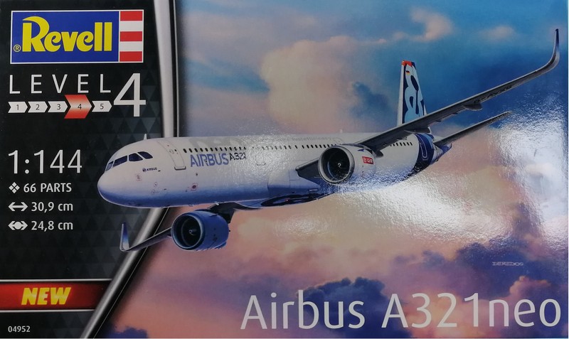 Modell: Kurz nach dem A320neo hat Revell nun den A321neo als Neuheit im Programm. Dieser Bausatz ist in Level 4 eingeordnet, was u.a. am vorhandenen Fahrwerk und der deutlich erhöhten Anzahl von 66 Bauteilen liegen wird. Die Bauteile finden sich an dabei an neun Rahmen aus weißen Kunststoff und einem aus klaren Plastik. Neu gegenüber dem 320neo Kit sind dabei die Rahmen G für das Fahrwerk sowie der Rahmen I mit den Teilen für die CFM LEAP Triebwerke. Und natürlich die beiden Rumpfhälften, um die längere A321 abzubilden. Diese ist übrigens im Modell rund 4 cm länger als der kleinere Bruder. Der im A320neo Bausatz enthaltene Ständer ist hier nicht vorhanden.