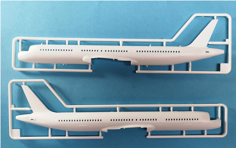 Ein paar Worte noch zur Türkonfiguration, Revell hat hier die klassische 2 + 2 Ausführung von den Gravuren her umgesetzt. Wie wir ja oben nachlesen können, bietet Airbus ja mit dem Cabin Flex hier auch andere Varianten an. Wenn man diese in Verbindung mit zusätzlichen Decals für Fluggesellschaften umsetzen will, muss man also hier Gravuren verschließen. Zur Darstellung der Türen/Notausgänge sind ja Abziehbilder eh normal. Für die von Revell gewählte Prototypenbemalung passt die aus dem Kasten dargestellte Konfiguration aber genau. Der erste Eindruck beim Betrachten der Bauteile ist sehr gut. Denn die Oberflächen gefallen mit feinen Gravuren und vielen Details. Es findet sich auch kein Grat an den Teilen. Die Aufteilung der Großbauteile ist dabei klassisch.