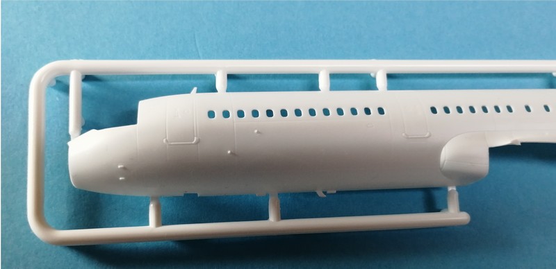 Neu sind am Rumpf aber zum Beispiel das einzelne Radom und das separate Seitenruder, was zu einer einteiligen Hinterkante führt. Diese finden wir auch an den Trag- und Höhenruderflächen. Mittlerweile Standard ist auch, das Revell für die offenen Fenster Streifen aus klarem Kunststoff zur vorbildgerechten Darstellung anbietet. Die Cockpitsektion besteht aus einer Haube. Die Fensterflächen sind dabei viel größer und damit auch richtig dargestellt. Dies war immer bei den alten Kits ein großer Fehler. Der Raum hinter den Scheiben bleibt übrigens nicht leer, sondern es ist ein richtiges Cockpit vorhanden. Das I-Tüpfelchen wären jetzt noch zwei Pilotenfiguren für die Flugdarstellung gewesen. Leider hat man die Antennen und Entwässerungsmasten wieder mit an eine Rumpfhälfte angegossen. Hier ist ein Verlust während des Baues recht wahrscheinlich. Evtl. empfiehlt es sich, die Antennen gleich mit einem feinen Skalpell zu entfernen und nach der Fertigstellung als letztes wieder anzukleben. Die große(n) Satellitenantenne(n) am Rumpfrücken ist(sind) ein separates Bauteil. Hier liefert Revell mehrere Varianten, weshalb man beim Verwenden von Zurüstdecals Vorbildfotos studieren muss.