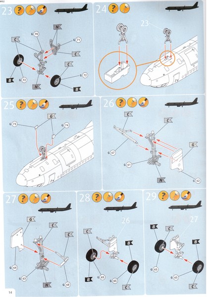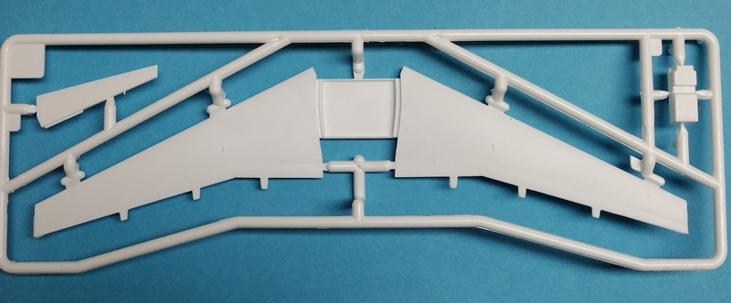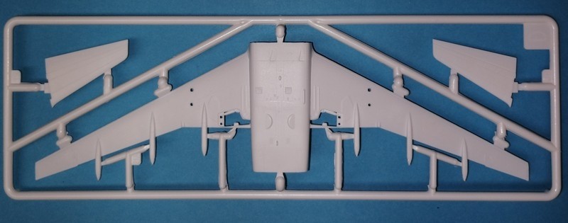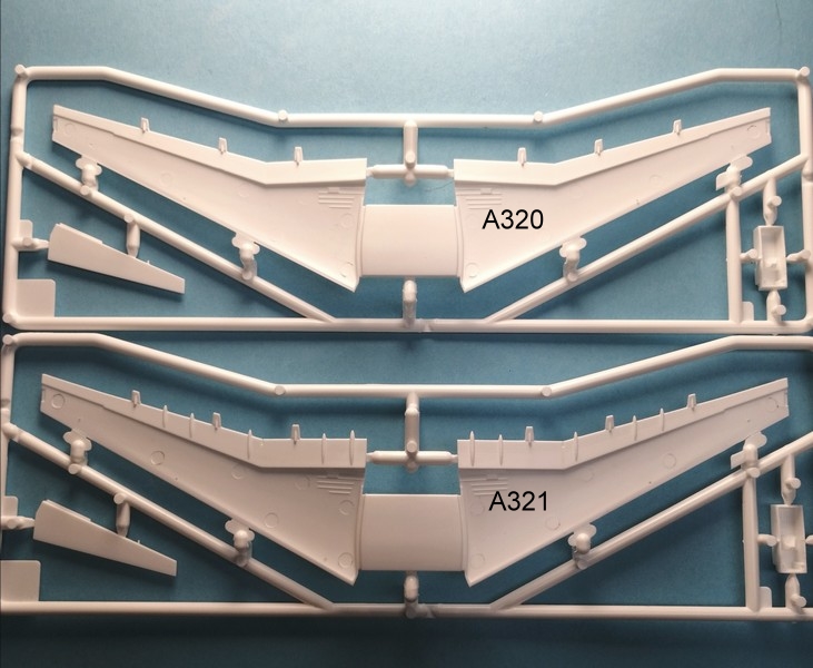 Die Tragflächen werden wie bisher aus einem Oberteil und einem Unterteil aufgebaut. Neu ist, dass auch das Oberteil mit einem Verbindungsteil durchgängig ist. Dieses verfügt über beidseitige Nuten, in diese der Rumpf von oben eingesetzt und geführt wird. Wenn alles gut passt, sollten sich Vorteile bei der Passung und die richtige V-Stellung der Tragflächen ergeben. Eine interessante Lösung im ersten Anschein. Die Verkleidungen der Flügelklappenmechanismen(Flaptrackfairing) sind dabei mit angegossen. Die Sharklets sehen Vorbildgerecht aus. Die Bereiche der Navigationslichter sind durch Gravuren angedeutet und nicht als meist schlecht passende Teile aus klarem Plastik vorhanden.