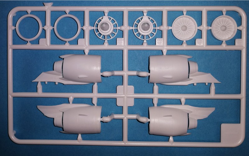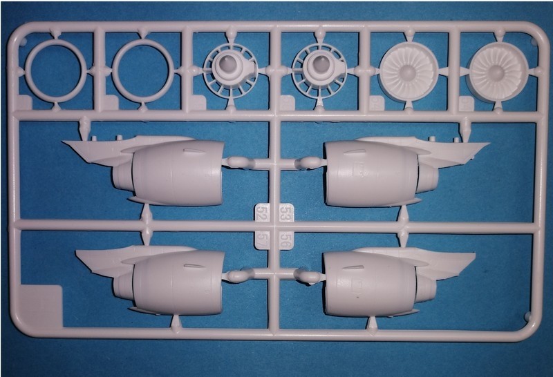 Optisch fallen natürlich die auch beim Vorbild auffälligen neuen Triebwerke mit dem deutlich größeren Fandurchmesser(Original rund 2m) auch beim Modell auf. Der Bausatz hier bietet beide Triebwerksvarianten, also P&W und CFM an. Auch hier erkennt man wieder die Bemühungen für eine leichte Montage und auch Bemalung. Ein Triebwerk entsteht aus fünf Bauteilen. Die wären die beiden Hälften der Verkleidung mit bereits anmodellierten Vortexblechen. Diese sind von vorne betrachtet sehr dünn. Der Fan ist einen Ring modelliert. Sehr gut sehen die Blätter des mit komplexen Formen versehenen Fans aus. Mit einer entsprechenden Bemalung sieht dieser bestimmt sehr gut aus. Der Einlaufring ist ebenfalls einteilig. Auch hier entfällt damit theoretisch das Spachtel und Abkleben bei der Lackierung. Dies gilt für beide Triebwerksausführungen.