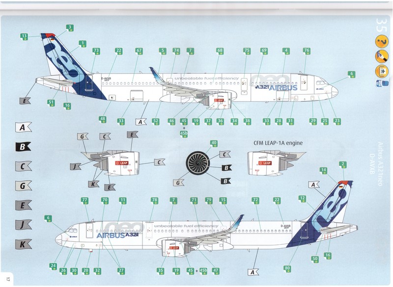 Die Entstehung des Modells wird in den 37 Baustufen der Bauanleitung klar und deutlich gezeigt. Diese bietet auch in den einzelnen Abschnitten wie immer Angaben zur Detailbemalung. Auf zwei farbigen Seiten wird dann die Bemalung und Position der Abziehbilder gezeigt. Bei Revell hat man sich für die beiden Prototypen von Airbus entschieden.