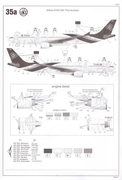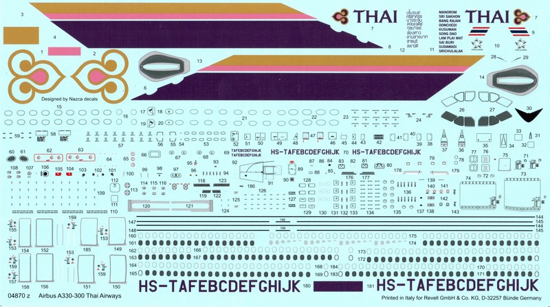 Wie auch in den letzten Jahren typisch für Revell, ist der Decalbogen erneut der Hingucker des Bausatzes. Entworfen wurde er von NAZCA Decals und enthält neben den allgemeinen Thai Markierungen wirklich jede Wartungs- und Bedienungshinweise des Flugzeugs. Der Druck ist glänzend und sehr gut in Qualität und Deckung. Entgegen anderen aktuellen Revell Bausätzen werden auch beide Fraktion der Fensterdarstellung bedient. Mit den im Kit enthalten PW-Motoren und den vorhandenen Buchstaben lassen sich 10 Maschinen der Thai Airways mit den Registrationen HS-TEA bis HS-TEK bauen. Die entsprechenden Taufnamen sind vorhanden.