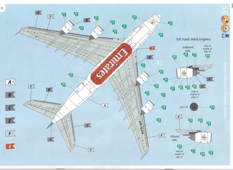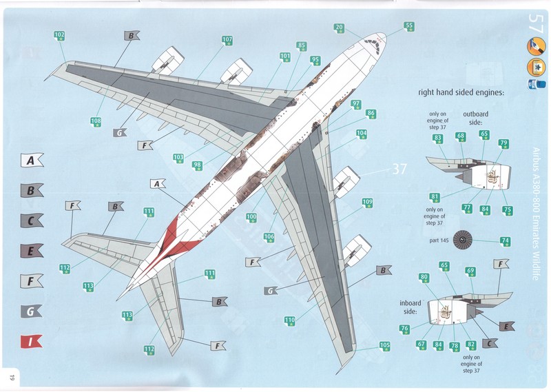 Die rote Fläche am Bauch muss maskiert und lackiert werden, bevor der große "Emirates" Schriftzug als Abziehbild angebracht werden kann. Insgesamt können mit den beiliegenden Kennungen drei Maschinen dargestellt werden, welche sich nur in ganz wenigen Details unterscheiden. Alle drei verwenden übrigens das GP7200 Triebwerk. Es handelt sich um die folgenden A380: