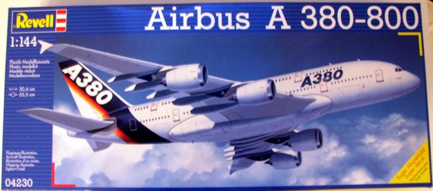 Mit dem Bausatz des Airbus A 380 hat Revell sich eines Flugzeuges der Superlative angenommen, welches erst 2006 fliegen soll. 555 Passagiere sollen zunächst in drei Klassen untergebracht werden. Das Original bringt es auf eine Spannweitevon 79,8 Metern und auf eine Länge von 73 Metern. Die Höhe soll 24,1 Meter und das maximale Startgewicht 560 Tonnen betragen. Das sind Maße und Gewichte, die in dieser Kombination noch nie vorhanden waren. Für die Flughäfen hat es Konsequenzen. Es ist der erste Jet der die Flughafenkategorie F benötigt. Zunächst sollen weltweit zwölf Flughäfen ab 2006 mit dem A 380 bedient werden. In Europa werden das London-Heathrow sowie -Gatwick und Paris Charles de Gaulle sein. Der Rhein-Main-Flughafen in Frankfurt muß bis 2007 umgebaut sein, da die Lufthansa ihre Flotte dort stationieren will.