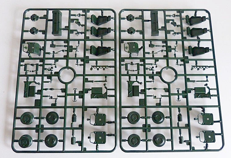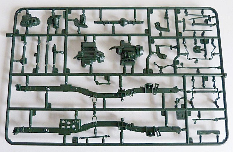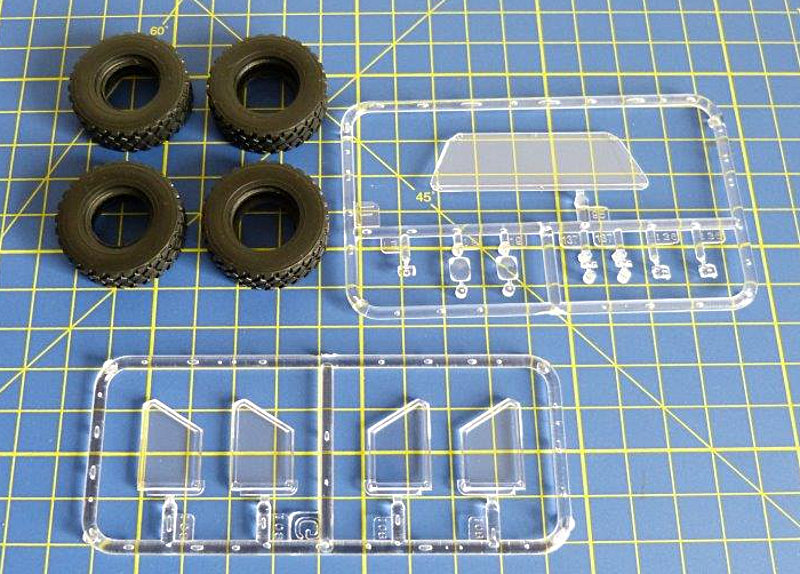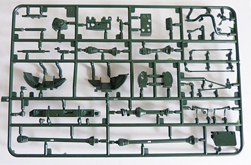 Der Schüttkarton mit ansprechendem Deckelbild beinhaltet 8 Dunkelgrüne Spritzrahmen und 2 Klarsichtgußrahmen. Natürlich dürfen die vier Profilreifen nicht fehlen. Das Profil ist gut ausgearbeitet worden, leider fehlt die Beschriftung auf den Reifen. Der Zusammenbau des Fahrgestells, umfasst allein 24 Bauabschnitte. Auch eine Motornachbildung liegt dem Bausatz bei. Sie ist aber etwas einfach gestaltet und wer den Motorraum sichtbar zeigen will, hat hier den Freiraum sich hier noch richtig auszutoben und noch ordentlich zu supern... oder man wartet auf den Zubehörmarkt. Dieser wird sicherlich noch einige Zurüstsets anbieten.