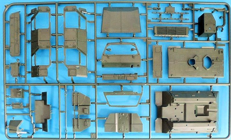 Bausatz: Nach dem Revell mit dem Erscheinen des Dingos 2 GE A2.2 PATSI schon unter Modellbauern moderner Bundeswehrfahrzeuge für einige Freude gesorgt hat, folgt jetzt die überarbeitete Variante A3.3. Im typischen Schüttkarton mit ansprechendem Deckelbild finden sich acht dunkelgrüne und zwei klare Gußrahmen.