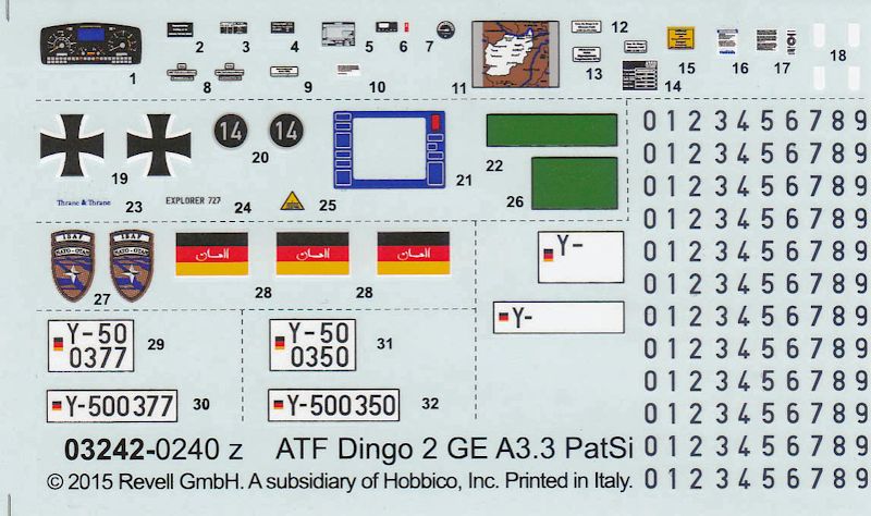 Bemalungsvarianten: Revell bezieht sich auf das hauseigene Farbensystem. Bei der Tarnung für die ISAF Fahrzeuge, muss der Grundton zusammengemischt werden.Der hervorragende gedruckte Decalbogen erlaubt den Bau von 3 Fahrzeugen: