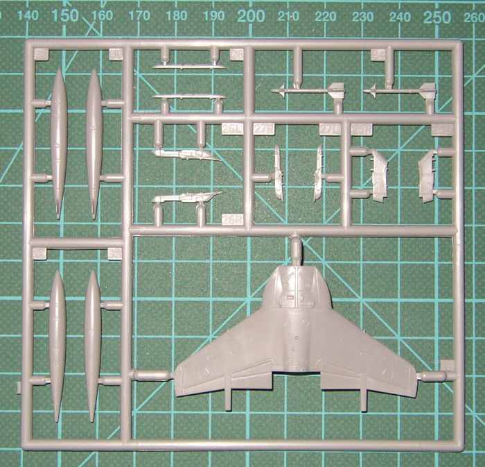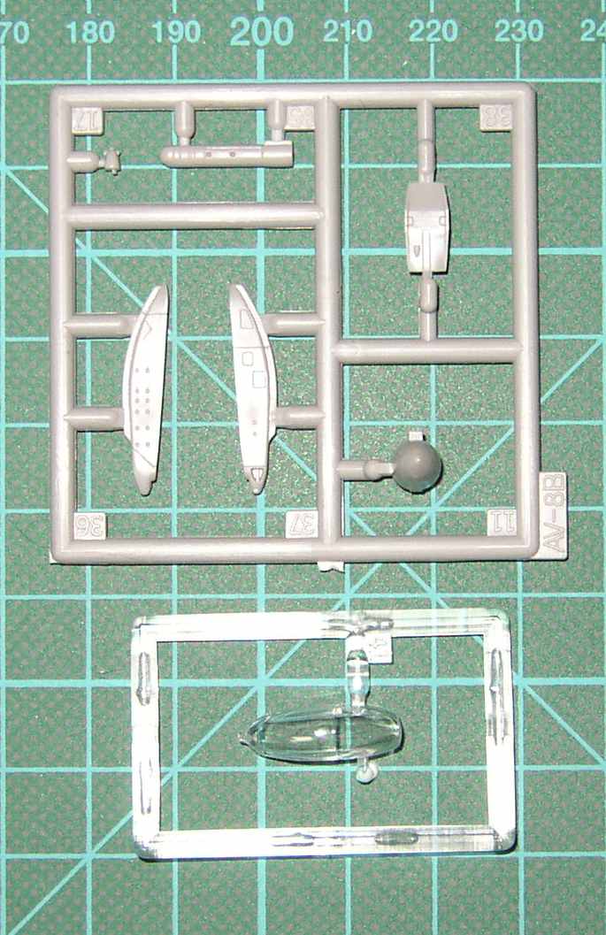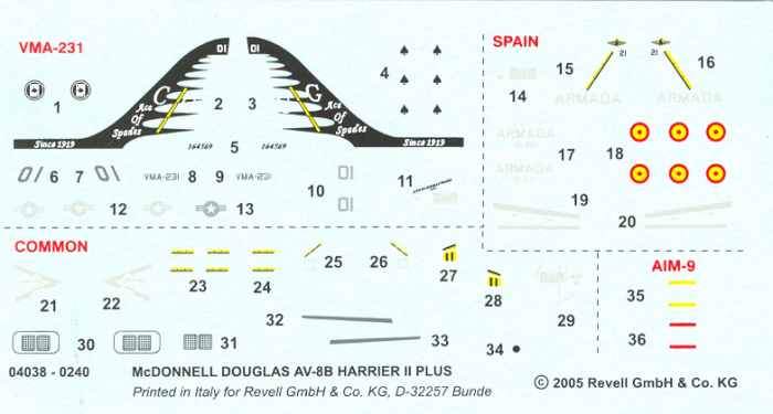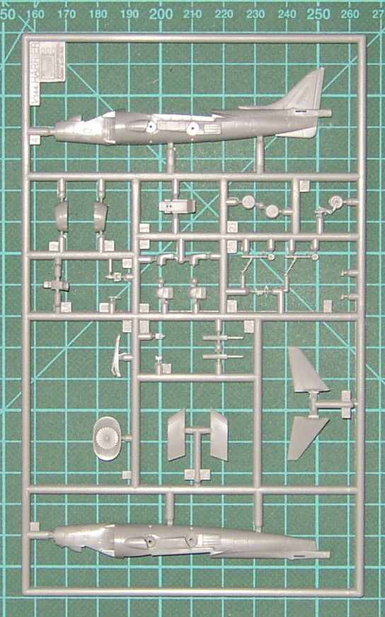 Bausatz: Revell hatte in der Vergangenheit schon Harrier im Maßstab 1:144 im Programm, jedoch handelte es sich hierbei um Kooperationsprodukte mit Dragon. Dieser Bausatz ist daher eine Neuentwicklung. Drei Spritzrahmen enthalten Teile, die unbedingt auf der Höhe der Zeit sind. Das Cockpit ist für diesen Maßstab sehr gut ausgestattet, die Gravuren sind noch fein, nur die Cockpithaube ist etwas dick. Die filigranen Fahrwerksteile entschädigen den Modellbauer dafür. Der Schleudersitz (ja er sieht wirklich so aus) besticht durch seine Ausführung. Die Decals sind für diesen Maßstab mehr als ausreichend und der Druck ist hervorragend.