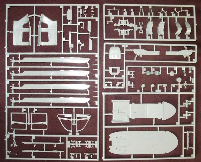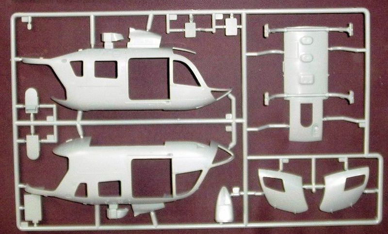 Ansprechender Karton, leider noch aus der wabbligen Pappe. Öffnet man den Karton erhält man den heftartigen farbigen und übersichtlichen Bauplan, sowie ein großen Beutel mit den Spritzgussteilen: sieben graue Spritzrahmen und ein extra Beutel mit Klarsichteilen. Sauber abgespritzt, enthalten sie alle Teile um den Polizeihubschrauber detailliert zu bauen. Der Cockpitbereich ist gut dargestellt und die Türen, die offen oder geschlossen dargestellt werden können sind auch innen graviert. Auch der Boden des Cockpits und des hinteren Bereichs ist gut darstellt.