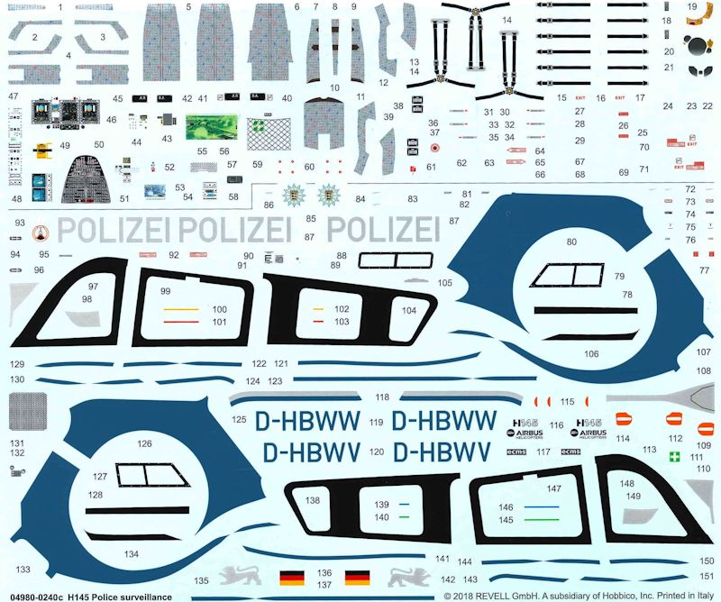 Bemalung: Die Abziehbilder sind sauber und versatzfrei auf hellblauem Papier gedruckt und erlauben die Darstellung eines Helikopters der Polizei Baden-Württemberg. Ferner sind noch Fensterrahmen, blaue Polizeidekoration. Wartungshinweise, Stuhlpolster und Sicherheitsgurte als Abziehbilder dabei. Die Farben sind auf das REVELL Farbsortiment abgestimmt.